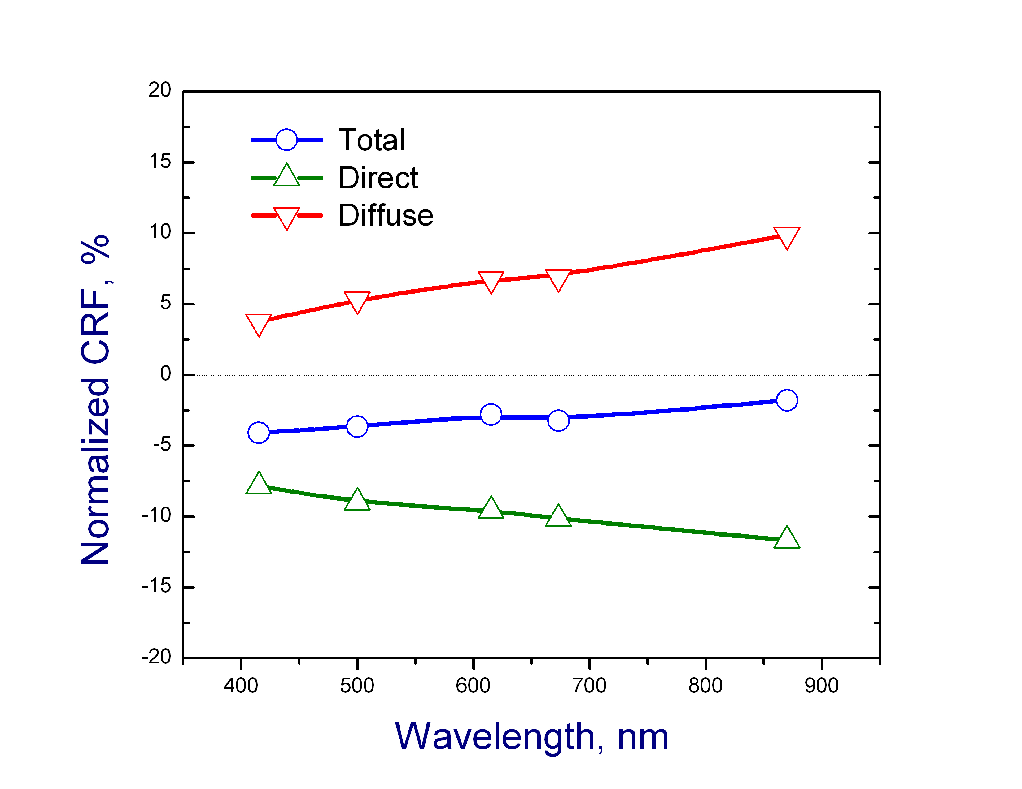 Our calculations reveal that magnitude and sign of the cloud impact on the amount of scattered solar energy reaching the surface can change substantially with wavelength—a conclusion that cannot be inferred using broadband fluxes. The observed spectral dependences for averaged radiative properties (Figure 1) are a powerful diagnostic for evaluating radiative transfer parameterizations in the current and future large‐scale models of the atmosphere, including climate models. This application would be particularly beneficial for studies aimed at describing the aerosol‐cloud-radiation interaction, mainly due to the large values of aerosol loading observed in the visible spectral range.