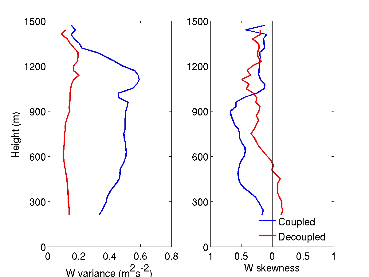 The instrumentation onboard the National Oceanic and Atmospheric Administration Ronald H. Brown ship during VOCALS-REx included a vertically pointing Doppler cloud radar, Doppler lidar, and radiometers. Balloon-borne radiosondes were also launched at regular intervals during the experiment to map the atmospheric thermodynamic and wind structure. Data from these instruments were combined to calculate the turbulence and thermodynamic profile of the lower atmosphere on hourly time-scales. Two distinct thermodynamic structures were observed during the study period: (1) Coupled – when the length scales of the processes within the boundary layer extended through its entire depth and (2) Decoupled – when the length scales of the processes at the cloud top and the surface extended until the middle of the boundary layer. We found the turbulence structure as characterized by the vertical velocity variance and skewness to be quite different for this thermodynamic distinction (Figure 2). The processes controlling the strength of the turbulence within the boundary layer include the radiative cooling near the cloud top, surface turbulent fluxes, and the change in winds with height within the boundary layer. When accounted for the magnitude of these processes in a parameter, called the velocity scale (w*), the changes in the turbulence structure for this distinction were able to be explained. When scaled by the velocity scale, the updrafts spanning through the entire depth of the boundary layer exhibited the same profile, both during coupled and decoupled conditions.