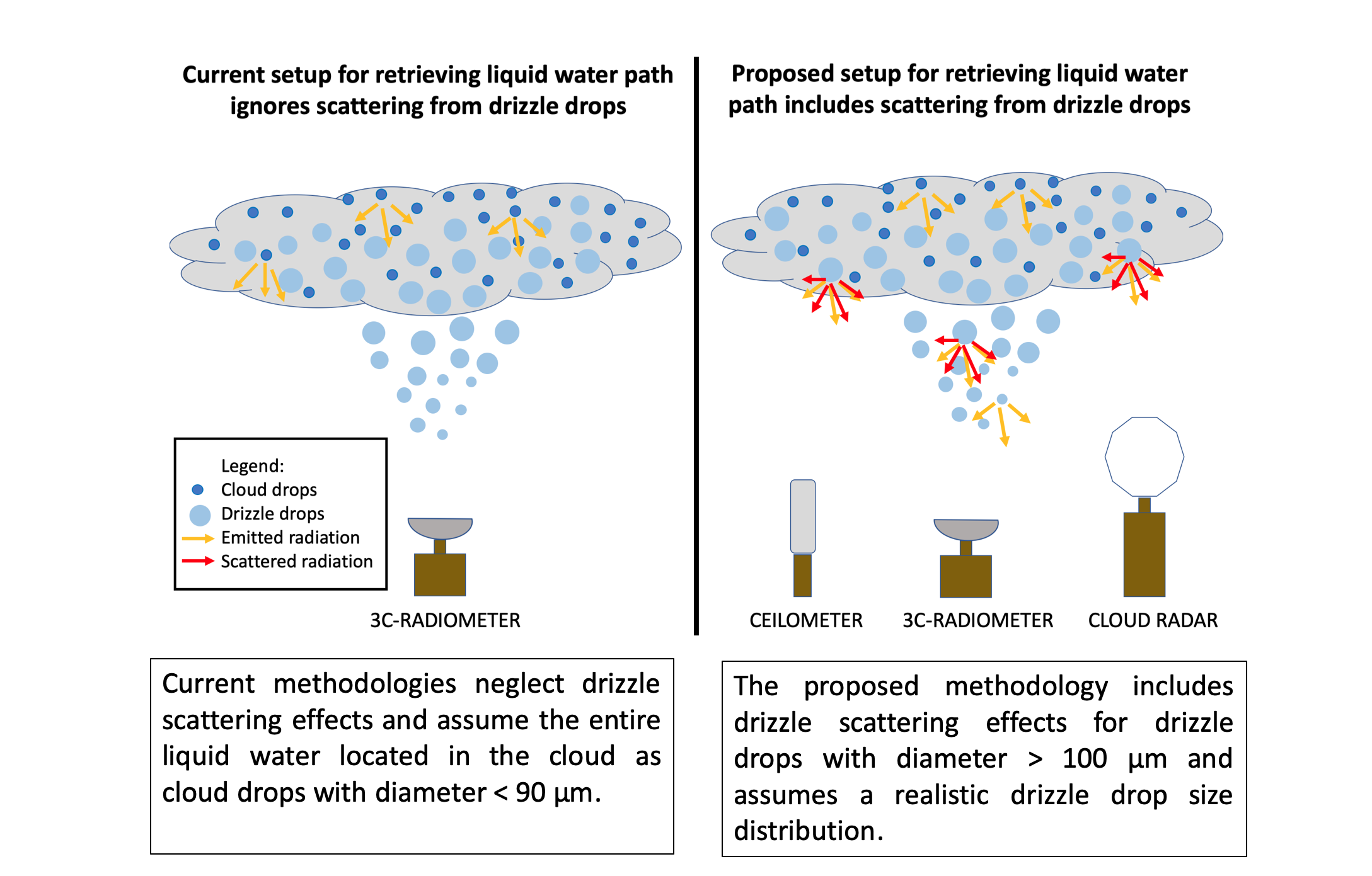 The study advances our knowledge of drizzling clouds, which contribute substantially to model uncertainties. This is the first study that combined observations from active and passive remote-sensing instruments to yield radiatively consistent and physically realistic estimates of integrated cloud and drizzle water path in and below cloud base.